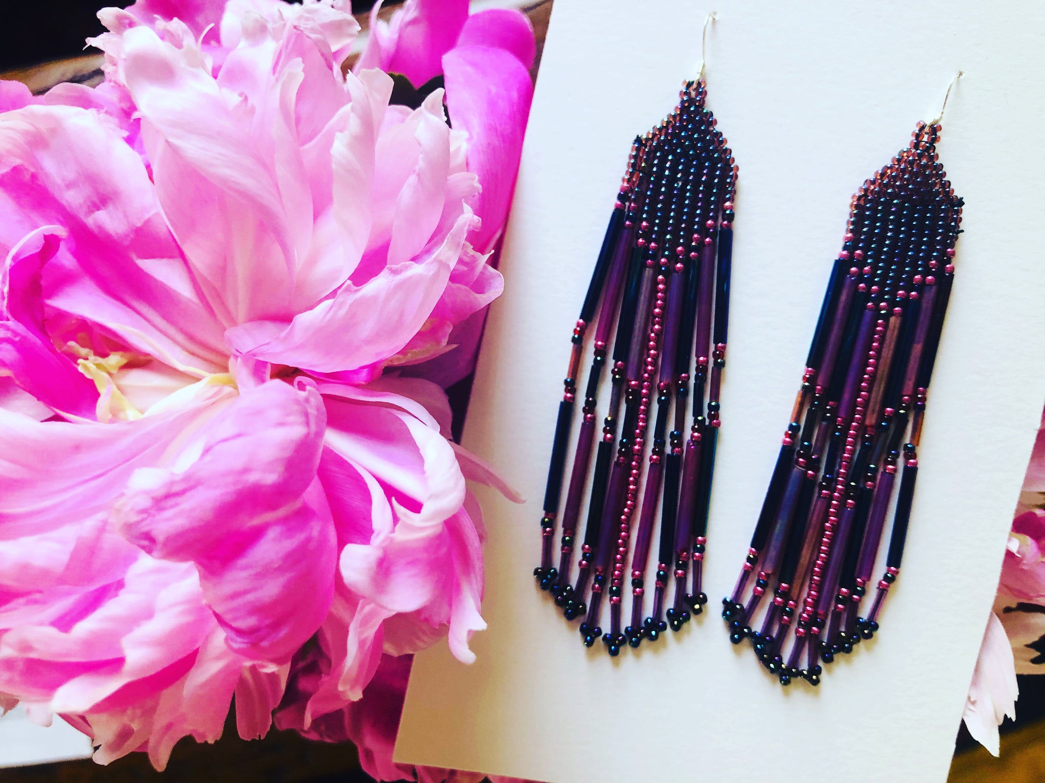 Shimmering Cranberry, pink, and iridescent navy seed beads, with Vintage Matte Cranberry and Navy Blue Irridecent bugle beads. Sterling Silver Hooks. Pretty in Pink. Length 4.5 inches long .9 inches wide.