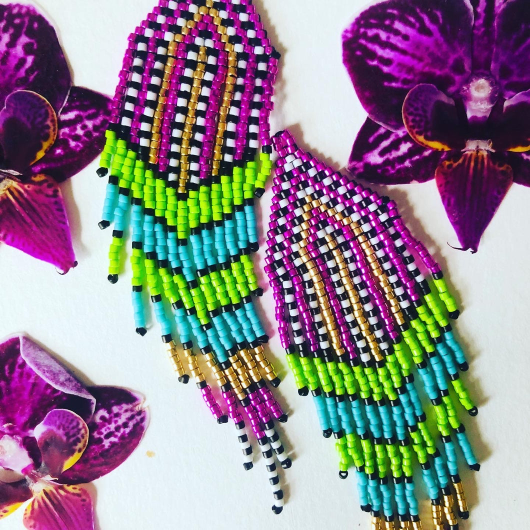 Made with all delica mini seed beads and no bugle beads this one certainly took a while to string. Pops of color and patterning make these earrings a show stopper. Bright purplish pink with green blue and gold seed beads and patterning withe and black seed beads and gold hooks. 4.6 inches long 1 inch wide.